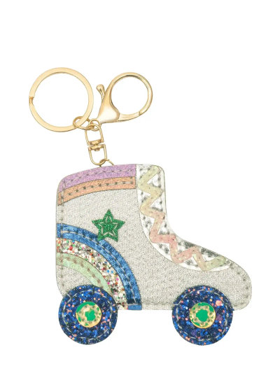 Keyring shaped as a side-by-side disco rollerskate with shimmer and glittery details.