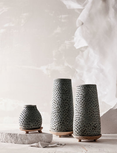 Oria laternu organiskās formas ir ar rokām darinātas no terakotas, pēc tam ar nelieliem kociņiem nejauši izdurti īpašie caurumi.