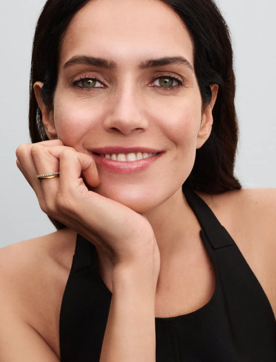 Šis elegantais un daudzpusīgais gredzens ar dubultu joslu ir veidots ar pulētu joslu, kas novietota paralēli otrai joslai, kas rotāta ar dzirkstošu pavē. Savienotais dizains rada uzmanību piesaistošu tekstūru un materiālu salikumu, padarot to par izcilu papildinājumu jebkurai juvelierizstrādājumu kolekcijai.
