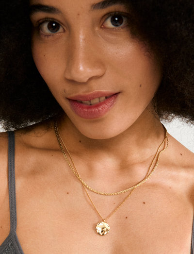 Divas atsevišķas ķēdes rada slāņainu efektu ar šo komplektu. Vienai ķēdei ir teksturēts, ar āmuru apstrādāts kulons, bet otrai ir klasisks virves dizains. Valkājiet tos kopā vai atsevišķi, lai iegūtu daudzpusīgu stilu.