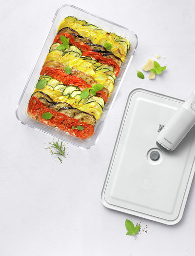 Lietojumprogramma: > Vakuuma trauku vienkārša sasaiste ar ZWILLING Culinary World App, izmantojot QR kodu uz vākiem, lai sekotu līdzi pārtikas produktiem un derīguma termiņam. > Bezmaksas lietotne aprēķina, cik ilgi var uzglabāt vakuumiepakotos pārtikas produktus un ēdienus, un atgādinājuma funkcija savlaicīgi informē, kad pārtikas produkti ir jāpatērē. Lietotnē piedāvātie pakalpojumi ir papildināti ar receptēm, skaidrojošiem videoklipiem un iepirkumu sarakstu.