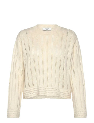 Delicate open knit details lend a touch of elegance to this lightweight pullover. The classic O-neck design and long sleeves make it a versatile piece for layering or wearing on its own. Ribbed detailing at the cuffs and hem add subtle texture and a refined finish.