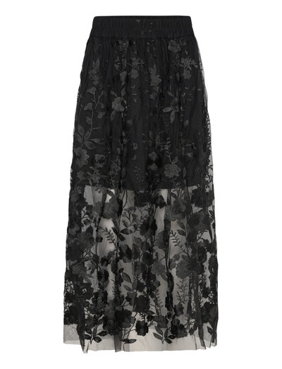 Fuschia Skirt is a long skirt in transparent mesh with embroidery. The skirt has an elastic waist and comes with a shorter underskirt.