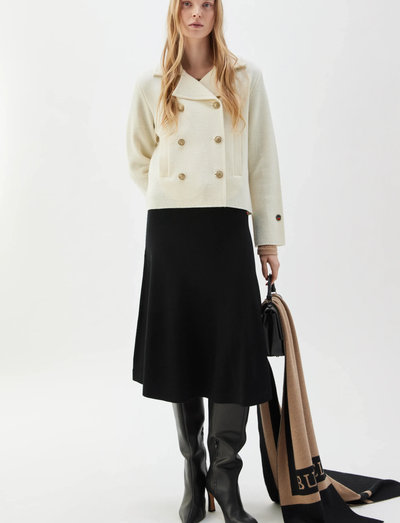 De INDRA-jas is een stijlvol en veelzijdig kledingstuk. Het heeft een klassiek dubbelrijig ontwerp met gouden knopen en een flatterende pasvorm. De jas is perfect om te dragen over je favoriete outfits en voegt een vleugje verfijning toe aan je look.