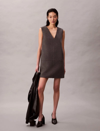 Deze elegante en moderne shiftjurk heeft een flatterende V-hals en een strak, minimalistisch design. De doubleface constructie zorgt voor structuur en een glad gevoel, waardoor het een veelzijdig kledingstuk is voor diverse gelegenheden.