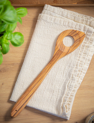 The olive wood is handcrafted and treated with sunflower oil. Olive wood is very dense and has narrow pores, so it does not absorb any odors. It does not scratch non-stick coatings, it tolerates acids, hot fat and dishwashing detergent. The olive wood is made from trees that are up to 500 years old and no longer bear fruit.