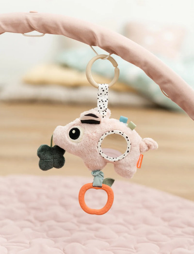 - Laat je kleintje zichzelf ontdekken in de spiegel en activeer de rammelaar door aan de appelvormige bijtring te trekken