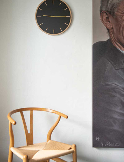 A simple and minimalistic wall clock in monochrome colours. The very light oak veneer are in sharp contrast to the black linoleum with carved-out hour indicators that really stand out. The classic round black clock face gives an exclusive expression and can be combined with clock hands in gold or copper to add warmth to the wood or with clock hands in black or silver to keep it subdued.