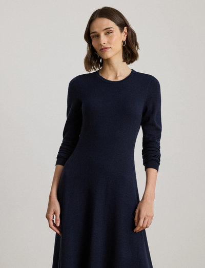 Deze jurk is gemaakt van zachte merinowol en biedt een verfijnd silhouet met lange mouwen en een zacht uitlopende rok. Het fijne breisel zorgt voor warmte en een soepele drapering, waardoor het een veelzijdige keuze is voor diverse gelegenheden.