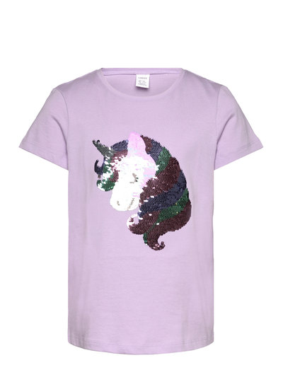 Deze t-shirt heeft een leuk en kleurrijk regenboogontwerp gemaakt van pailletten. Het is perfect om een toets van glitter toe te voegen aan elke outfit.