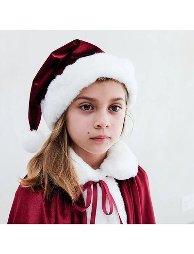 Stunning burgundy santa hat with white plush edges and a top tassel. Age: 3-8 yrs