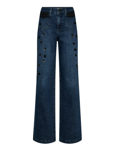 Deze jeans met wijde pijpen biedt een flatterende en comfortabele pasvorm. Decoratieve knopen accentueren de zijkanten en voegen een vleugje visuele interesse toe aan dit stijlvolle denim item.