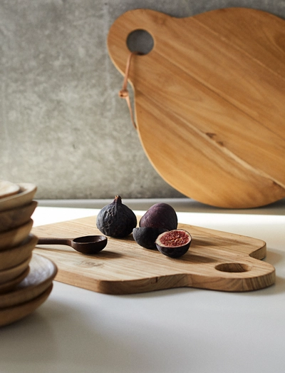 Cutting board fromMuubs in teak wood with a leather strap and a handle. A cutting board is both practical and decorative.