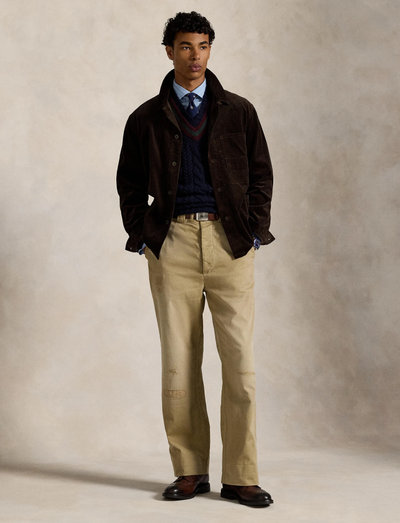 Deze jas van gewassen breedgeribd corduroy heeft een vintage uitstraling. Geïnspireerd door klassieke Franse werkkleding, heeft het een rechte kraag en een knoopsluiting met corozo-knopen. De lange mouwen hebben barrel cuffs met knopen, en het handgedetailleerde ontwerp omvat een meerlaags verfproces.