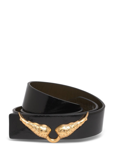 Een opvallende gesp definieert deze omkeerbare riem, die twee looks in één biedt. Het gevleugelde detail voegt een edgy touch toe, perfect om jurken te accentueren of flair aan jeans toe te voegen.