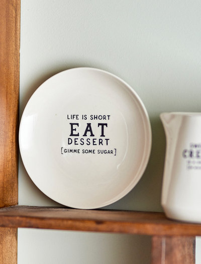 Wendy Plate fra Creative Collection er en morsom desserttallerken med et søtt sitat på: "Livet er kort, spis dessert (gi meg litt sukker)". Kaketallerkenen er laget av steintøy med hvit glasur og svart trykk. Et koselig fat til servering av kake og dessert.