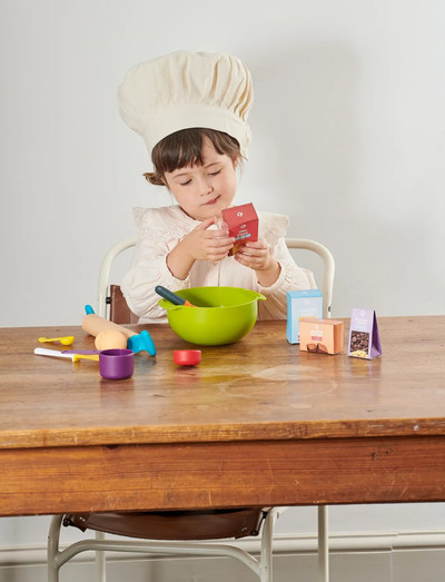 Inspire your little baker to get busy in the kitchen! The set includes everything needed for baking treats — a mixing bowl, rolling pin, spatula, whisk, and four measuring spoons. Suitable for real baking or pretend play. Ages 3+