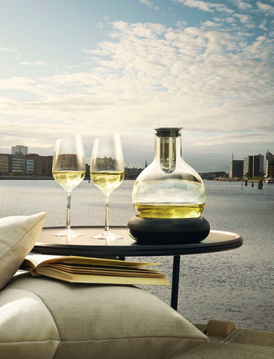 Og den nye Eva Solo dekanteringskaraffelen dekanterer vinen skånsomt gjennom den integrerte trakten, som er perforert av mange bittesmå hull. Når vinen renner gjennom de små hullene og fortsetter ned langs innsiden av karaffelen, luftes den skånsomt og effektivt siden overflaten på vinen som kommer i kontakt med luft, blir stor.