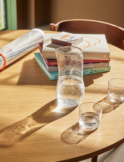Sui Jug Jug er elegant formet av glass i en asymmetrisk, organisk form som umiddelbart fortryller. Den subtile innblandingen av luftbobler gir en fascinerende tekstur, og når sollyset danser gjennom de unike konturene, kastes det fengslende skygger som tilfører et subtilt snev av magi til ethvert rom. Sui Jug er ideell for servering av kjølige drinker eller for å pynte opp på en hylle, og gjør enkle daglige aktiviteter til en visuelt poetisk opplevelse.