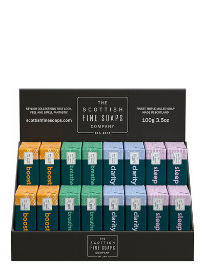 Aromaterapi Soap Display inneholder fire forskjellige såper. Hver såpebar er laget med spesielt utvalgte eteriske oljer, solsikkeolje, kokosolje og rapsolje såpebase for å tilføre fuktighet og rengjøre på samme tid.