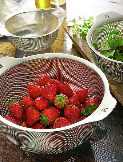16 cm dørslag i 18/10 rustfritt stål vasker og skyller frukt og grønnsaker, og siler kokt mat som pasta eller poteter. designet for å passe til zwilling 16 cm gryter og panner. designet av matteo thun og antonio rodriguez. tåler oppvaskmaskin. vær oppmerksom på at dette er en enkelt vare, ikke en pakke.