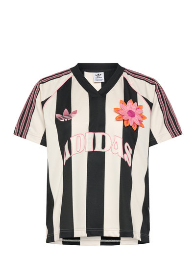 Denne adidas Originals-jerseyen har et slående design. Den har loddrette striper og en brodert blomst. Den ikoniske adidas-logoen er tydelig synlig. Denne jerseyen er et stilig tilskudd til enhver garderobe.