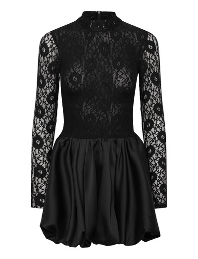 Denne minikjolen er laget med intrikate blondedetaljer, og har lange ermer og en høy hals, som gir et sofistikert, men likevel forlokkende utseende. Satengskjørtet tilfører et snev av luksus og volum, noe som gjør den perfekt for kveldsarrangementer.