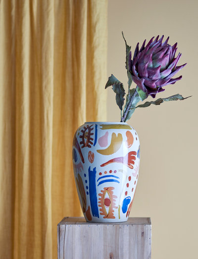Horus-vasen fra Bloomingville er vakkert dekorert med et uttrykksfullt motiv som danner en harmonisk blanding av varme og kjølige nyanser. Det kreative uttrykket gjør vasen til midtpunktet i enhver setting. Enten den rommer en frisk bukett eller står alene, er den designet for å imponere.