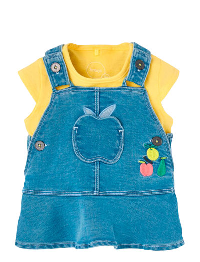 Dette settet inkluderer en t-shirt med korte ermer og denimoveraller. Overallerne har et søtt epledesign og en volangkant. T-skjorten har en rund hals og korte ermer.