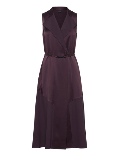 Denne kjolen er designet uten ermer og har en flatterende omslagssilhuett. Midi-lengden og det belte i midjen skaper et sofistikert og elegant utseende, perfekt for kveldsarrangementer.