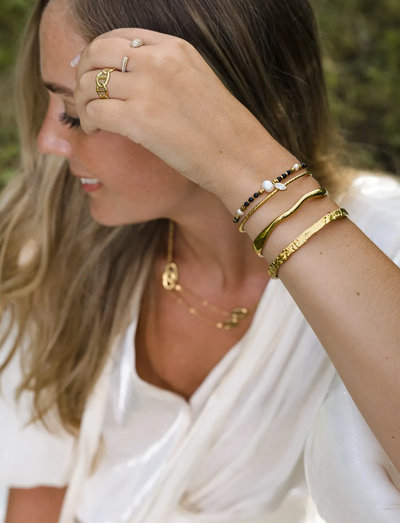 Dette elegante armbåndet har en flytende, åpen design, noe som gjør det til et allsidig tillegg til enhver smykkesamling. Den fleksible formen sikrer en komfortabel passform, perfekt for hverdagsbruk eller spesielle anledninger.