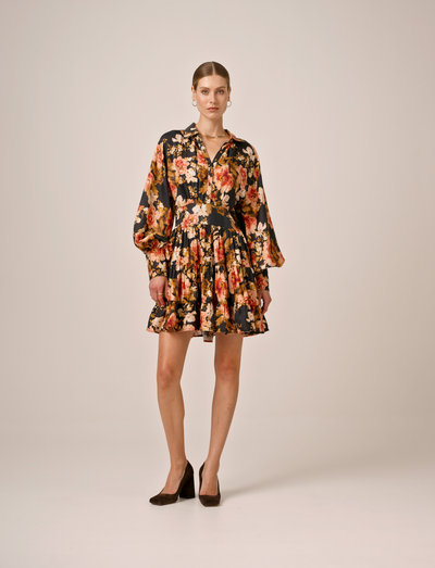 Denne kjolen er laget av en blanding av lin og viskose. Den har en tettsittende midje med elastisk smocking i ryggen og et voluminøst A-formet skjørt. Kjolen har en skjortekrave, knapper ned langs toppen og lange, voluminøse ermer med stramme mansjetter. Den lukkes på siden med en glidelås.
