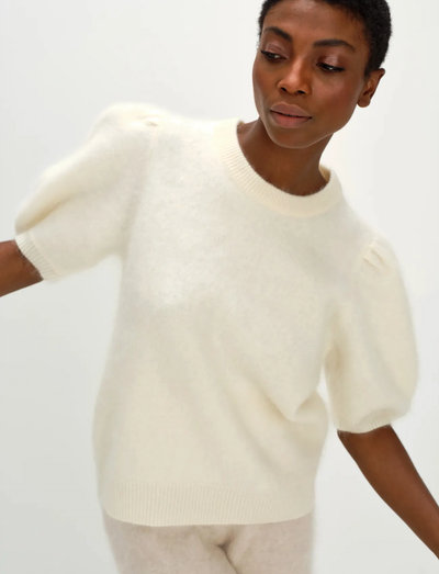 Denne kortarmede toppen er definert av sin chunky strikkekonstruksjon, noe som gjør den til et koselig, men stilig valg. Den har distinkte puffdetaljer på skuldrene, en klassisk rund hals og en flatterende kort passform som er avsluttet med en ribbestrikket kant.