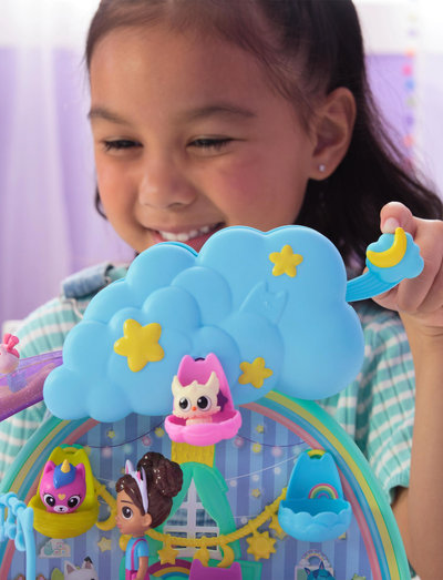 Skap spennende barnevaktopplevelser med Gabby og babykattene i Kitty Care Ear Purrfect Playroom. Dette lekesettet med 17 deler inneholder en Gabby-figur, tre babykatter og et barnerom fullt av overraskelser. Bytt på å kjøre ned sklia, gå tur i vognen, bruk barnestolen til måltidene, pakk ut en dukkehusleveranse for å oppdage en overraskelsesleke før du skanner QR-koden i leveransen for å låse opp en belønning i Gabby's Dollhouse-appen. Etter leken kan du putte dem i vognen og vugge dem i søvn. Gabbys dukkehusleker for jenter og gutter er gaver til barn som liker å bygge lekeverdener i dukkehus. Gjør deres inntreden i dukkehusleken minneverdig med elskelige lekefigurer, dukkehustilbehør og dukkehusmøbler som de kan samle på og konfigurere. Bygg opp verdenen din med husbyggesett, som et lekekjøkken eller et musikkrom, og mange ting å samle på, som et fantastisk cruiseskip og et basseng med havfruetema. Det helt nye Partyrom-lekesettet inneholder et dukkehusloft med innendørs skatepark og supersøte dukkehusbalkonger med mini-fidgetleker som gir tilfredsstillende sanselek og fungerer sømløst med begge versjonene av dukkehuset.