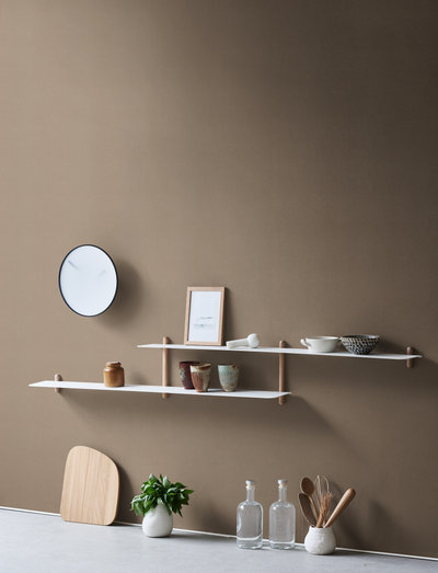 Nivo er en minimalistisk vegghylle designet av Böttcher & Kayser for Gejst. Uten unødvendige detaljer og med rene linjer henger Nivo lett og elegant på veggen. Hver eneste komponent er nøye gjennomtenkt både når det gjelder design, form og funksjon. Det er ingen synlige skruer, og hyllene er enkelt plugget inn i trestolpene, som har slisser som er laget nøyaktig for å passe.