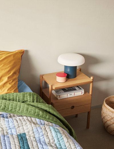 Her er en eviggrønn bordlampe i en nydelig dypblå farge og en vakker, hvit glasskjerm. Perfekt som skrivebordslampe, leselys eller for å skape litt stemning.