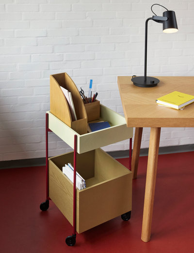 Khaki- og burgunderfarget tralle på hjul i FSC®-sertifisert treverk til oppbevaring eller kontorrekvisita.