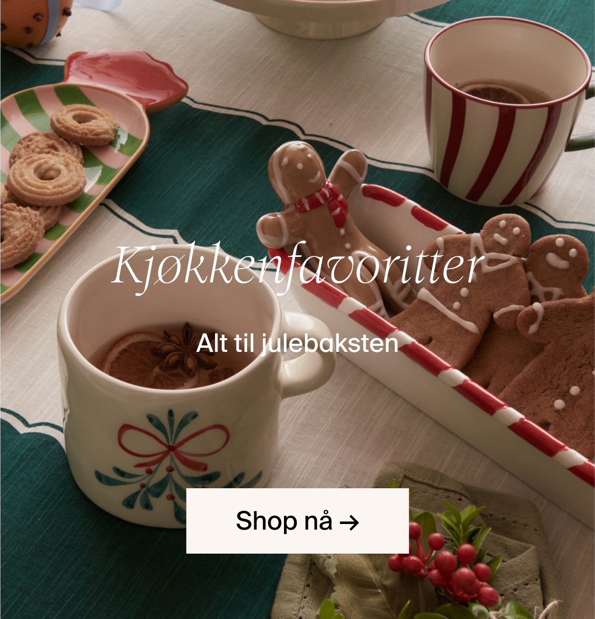 Oppdag alt du trenger for å feire sesongen med stil. Fra glitrende lys og festdekorasjoner til flotte tekstiler, bordservise og bakeutstyr – finn det perfekte tilbehøret for å fylle hjemmet ditt med varme og glede.
