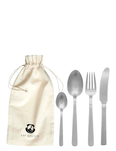 Det 4-delte bestikksettet består av en middagskniv (19,5 cm), en middagsgaffel (19 cm), en middagsskje (19,5 cm) og en teskje (13 cm). Leveres i Kay Bojesen gavepose i 100% bomull.