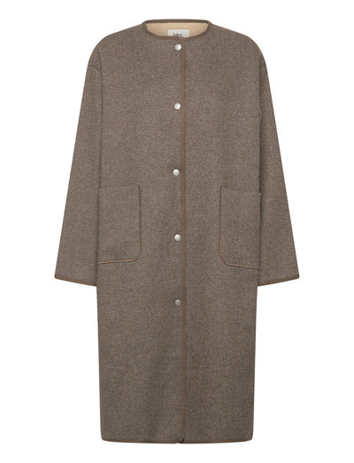 Syntetisk fôrDenne kåpen i ullblanding har et mykt teddyfôr som gir en avslappet og behagelig passform. Herringbone-veven tilfører et snev av tekstur, mens kontrastkantene gir en subtil detalj. Den er avsluttet med store, praktiske frontlommer og trykknapplukking.