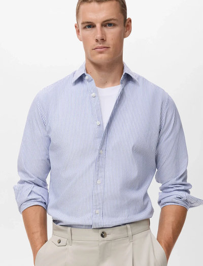 Regular fit, 100% cotton fabric, Stripe design, Shirt collar, Long sleeves with buttoned cuffs, Front closure with buttons, Rounded base
