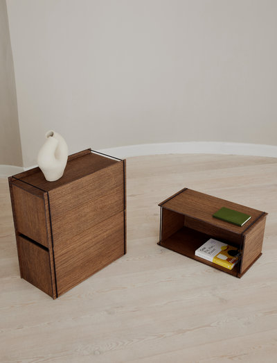 Den komponentbaserte designen leveres flatpakket og kan settes sammen og tas fra hverandre etter behov. De to firkantede metallrammene låser boksen sammen, samtidig som de fungerer som bærehåndtak. Designet for å være i ett stykke eller for å stables sammen. Legg dem flatt eller still dem opp. Vi anbefaler å stable maksimalt tre esker.