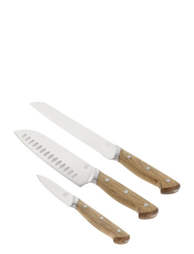 Knivsettet med santokukniv, brødkniv og urtekniv er det perfekte knivsettet til kjøkkenet. Knivbladene er laget av rustfritt kvalitetsstål, og håndtakene er av polert eik som over tid kommer til å utvikle patina og bare bli vakrere desto mer knivene brukes. Trehåndtakene er laget av ett trestykke, og de er komfortable å holde rundt. Santokukniven er designet med luftlommer som sørger for at det du skjærer av, ikke fester seg på bladet.Vaskes med varmt vann og mild såpe, og tørkes umiddelbart. Skal ikke vaskes i oppvaskmaskin.Tredelen av varen er FSC®-sertifisert eik (FSC-C166612).