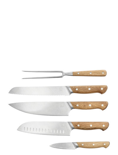 Knivsettet med kokkekniv, stekegaffel, brødkniv, santokukniv og urtekniv er det perfekte settet til kjøkkenet. Gaffelen og knivbladene er laget av rustfritt kvalitetsstål, og håndtakene er laget av oljet eik som utvikler patina over tid og bare blir finere desto mer settet brukes. Trehåndtakene er komfortable å holde rundt. Santokukniven er designet med luftlommer som sørger for at det du skjærer av, ikke fester seg på bladet.Vaskes med varmt vann og mild såpe, og tørkes umiddelbart. Skal ikke vaskes i oppvaskmaskin.Tredelen av varen er FSC®-sertifisert eik (FSC-C166612).