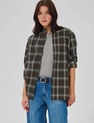 Denne langermede skjorten har en båndkrage og knappelukking, og gir en avslappet silhuett. Det rutete mønsteret gir et visuelt interessant uttrykk, noe som gjør den til et allsidig tilskudd til enhver garderobe.