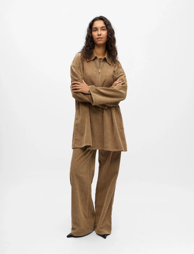 Denne skjortekjolen er laget av slitesterk twill, og gir et klassisk utseende med sin distinkte diagonale struktur. Den oversized passformen sikrer en komfortabel og avslappet silhuett, supplert med vide, lange ermer og en smart skjortekrage. En kvart glidelåslukking gir en moderne touch til dette allsidige plagget, som passer for ulike anledninger.