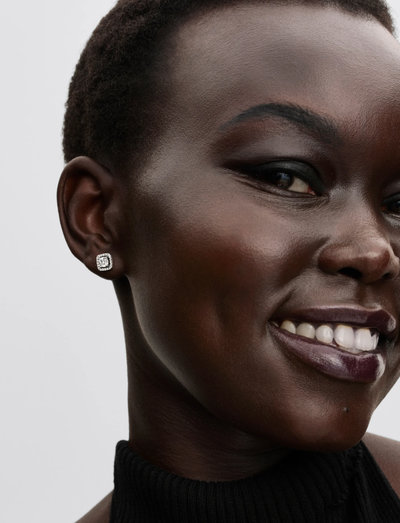 Disse øredobbene i sterlingsølv gir et sofistikert preg til ethvert antrekk. Hver øredobb har en firkantet midtstein, forsterket av en halo av mindre pavésteiner for ekstra glans og eleganse.