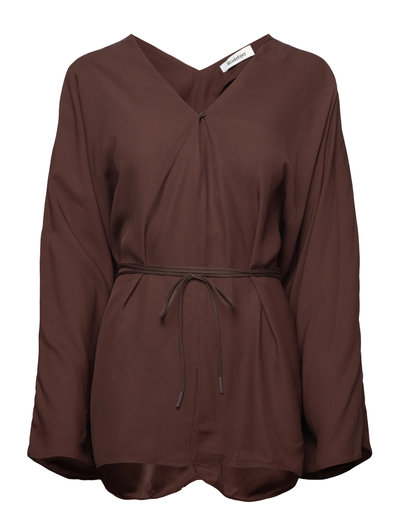 Med sin avslappede silhuett har denne toppen en flatterende V-hals og et knytebelte for en justerbar passform. De lange ermene bidrar til det elegante fallet, noe som gjør den til et allsidig plagg for ulike anledninger.