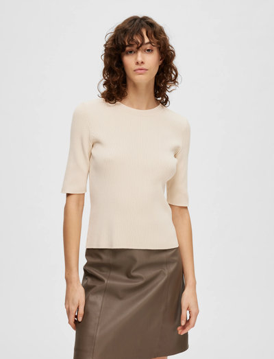 Dette er en stilig og komfortabel strikketopp med en klassisk rund hals og korte ermer. Den er laget av en myk og pustende blanding av viskose og nylon, noe som gjør den perfekt til hverdagsbruk.