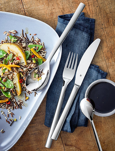WMF Nuova Series-bestikket er laget av polert Cromargan®-stål og passer inn i alle serviser takket være den stilige og tidløse designen. Bestikket tåler oppvaskmaskin. Settet inneholder spiseskje, gaffel, kniv og teskje. Rustfritt Cromargan-stål 18/10 Lett å rengjøre, smakløst og syrebestandig Tåler oppvaskmaskin